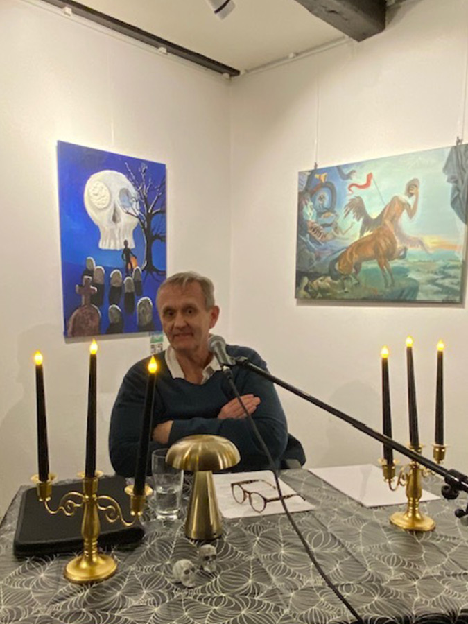 Im Rahmen des Halloween Specials ergab sich ein Moment, der mir besonders in Erinnerung bleibt: Arne Spitzer las Texte von Edgar Allan Poe, begleitet von Hella Luzinde Halm auf der Harfe. Mein Bild hing direkt hinter dem Vorlesenden – wie ein stiller aber dennoch präsenter Begleiter. Genau diese Konstellation hatte eine eigene Spannung: Wort und Musik im Vordergrund, Malerei im Hintergrund – und trotzdem zog das Bild immer wieder Blicke auf sich.